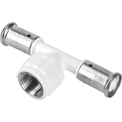 Henco pres tee af rustfrit stål med indvendig gevind, O-ring af EPDM og preshylser. Designet til systemer med et maksimalt tryk på 16 bar.