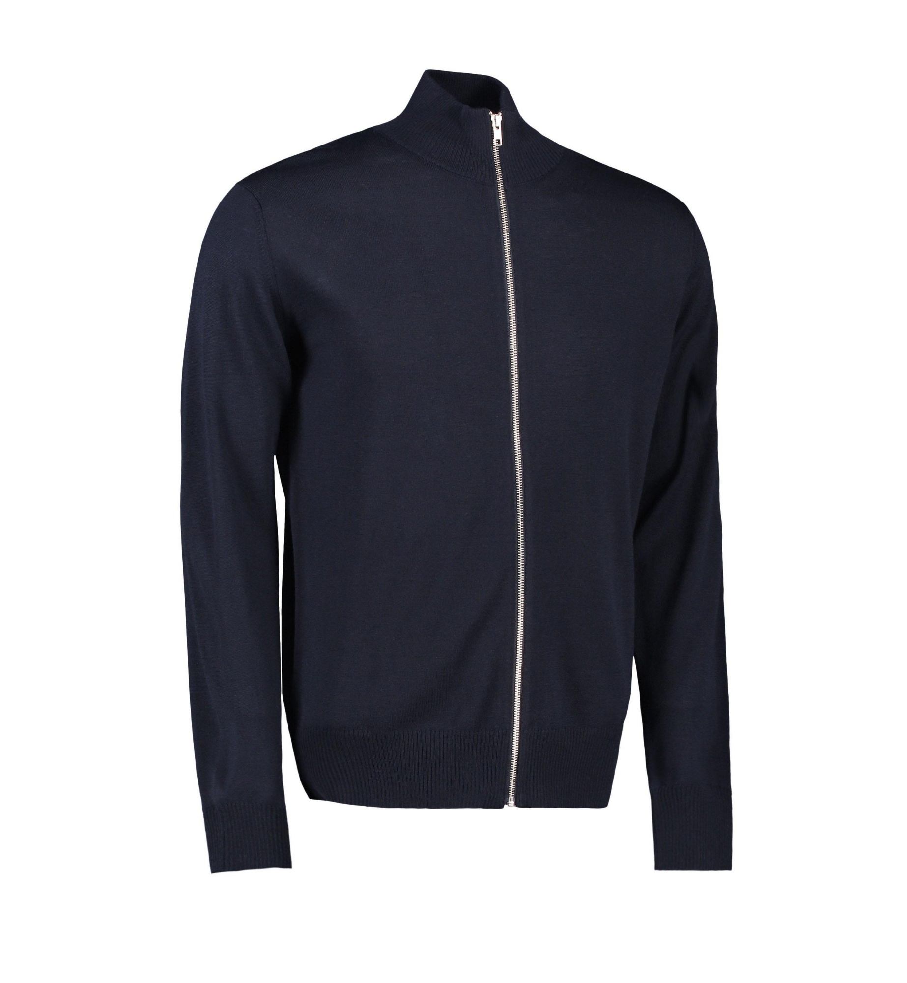 Elegant strikcardigan med lynlås og høj krave i blød merino uld. Tidsløst udtryk. Perfekt til arbejde og fritid.