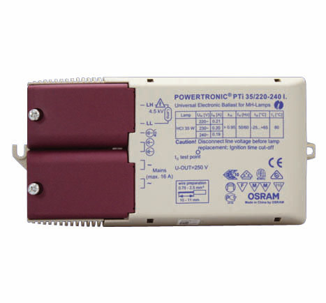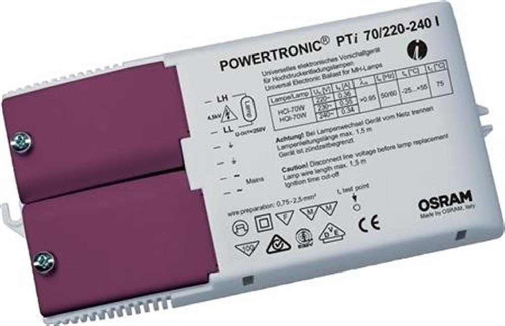 Osram Powertronic PTI 70W/220-240L er en HF-forkobling til metalhalogenlamper (HCI, HQI). I-versionen er designet til uafhængig montage med aflastning.