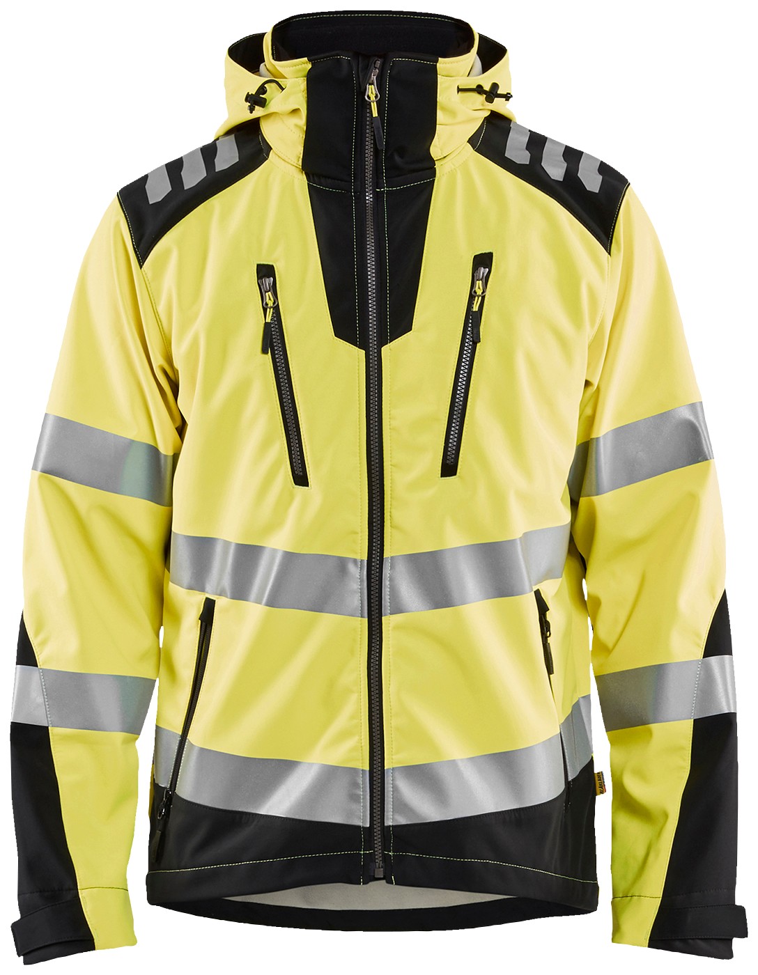 Denne High Vis Softshell jakke i gul/sort, str. M, er lavet af 92% polyester og 8% elastan. Den er vandtæt og vindtæt.