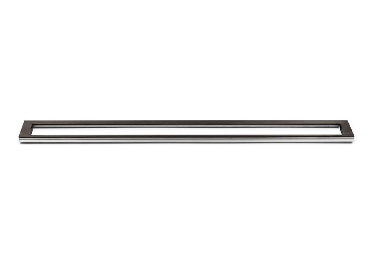 Unidrain Highline Colour ramme på 700 mm i sort rustfrit stål, 25 mm tyk, vist fra siden på hvid baggrund.Unidrain Highline Colour ramme i sort, 700 mm lang og 25 mm høj, set fra en vinkel, der viser den dybtrukne konstruktion af rustfrit stål.