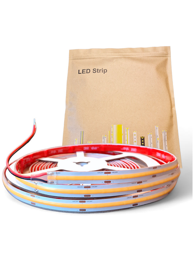 Fleksibel 24V COB LED strip med høj farvegengivelse (CRI95+). Perfekt til belysning, der kræver præcis farvegengivelse. Kan klippes for tilpasning.