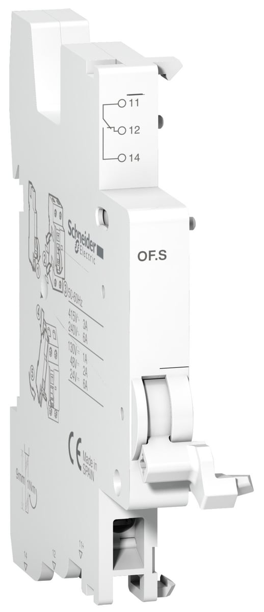 Hjælpekontakt OF.S 1CO for iid. Udløserhjælpeudstyr til underspændingsudløser, shuntudløser og overspændingsudløser. Indikatorhjælpeudstyr til åben/lukket-kontakt og fejlindikatorkontakt.
