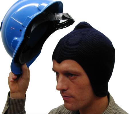 Blå, strikket hjelmhue i one-size. Perfekt til brug under sikkerhedshjelmen. Holder hovedet varmt og øger komforten på arbejdspladsen.