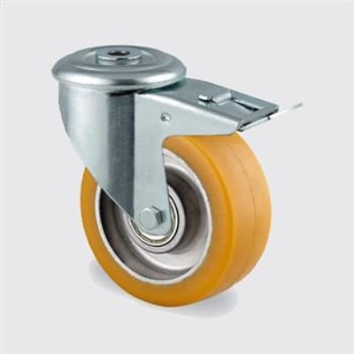 Dette transporthjul på 80mm har en drejelig gaffel og integreret bremse, hvilket sikrer stabilitet og kontrol. Hjulet er fremstillet af slidstærkt polyuretan og kan bære op til 150kg.