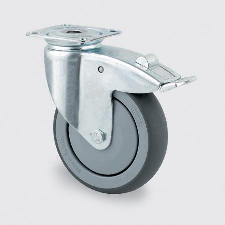 Drejeligt hjul med bremse, gummi, 150 mm, 100 kg, DIN-kugleleje, med plade. Byggehøjde: 185 mm. Hulafstand: 56x46,5 mm.