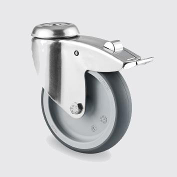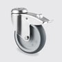 Drejeligt hjul med bremse, grå gummi, Ø75 mm, 75 kg, glideleje, med bolthul, rustfri, byggehøjde: 100 mm. Bolthul Ø 11.