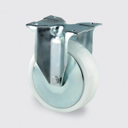 Fast transporthjul fra Tente med stålgaffel, dobbelt kuglekrans og zink-kromatisering. Boltet fast hjul med polypropylen fælg og hvid massiv gummi hjulbane. Testet iht. EN 12532.