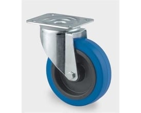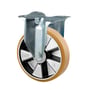 Fast hjul med gaffel af kraftig presset stålplade, forstærket og gul-kromatiseret. Hjulet er boltet i gaffel med pladebefæstigelse. Hjulfælg af aluminium og hjulbane af polyuretan med DIN-kugleleje.