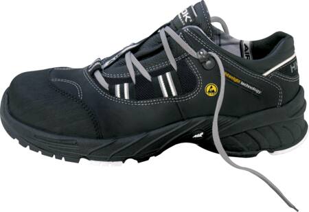 Sikkerhedsskoen har en ekstra bred pasform og er ESD godkendt. Den er skridfast og resistent over for olie, syre og benzin.