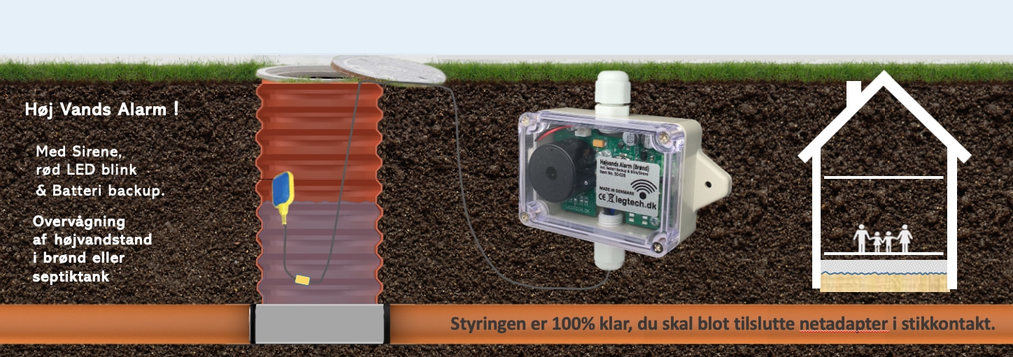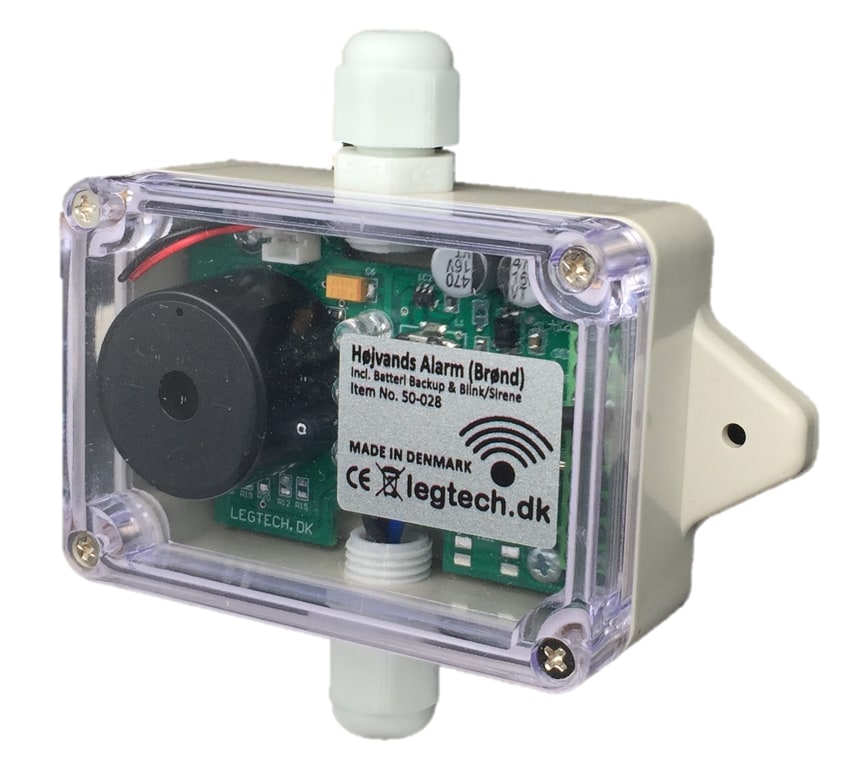 Simpel og billig højvandsalarm til overvågning af vandstand i brønd eller septiktank. Med sirene, blink og batteri backup. Uden SMS modul.