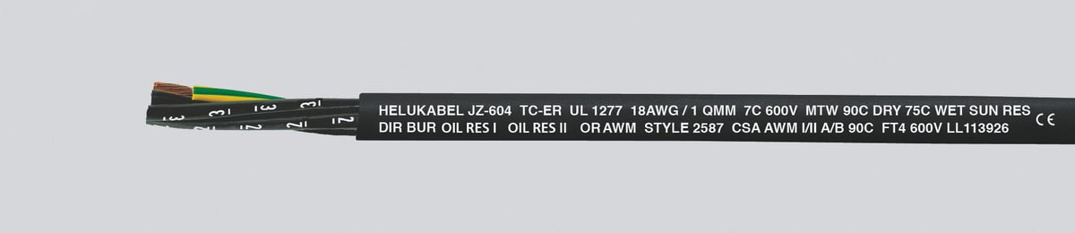 PVC multinorm kabel til strømforsyning i åbne installationer. TC-ER, NFPA 79, 90°C, 600 V, metermærkning.