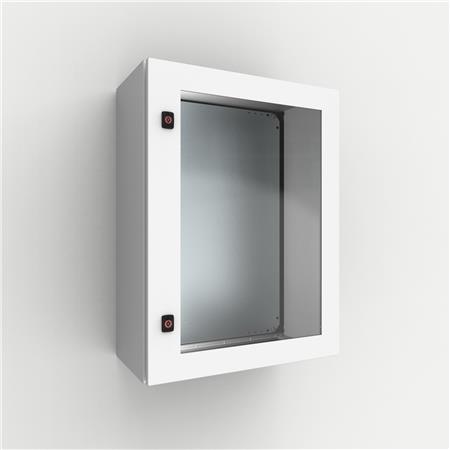 Højglanspoleret dør til erstatning af standarddøren. Giver indsigt til de installerede komponenter i skabet. Kan bruges med låseprogrammets udstyr.