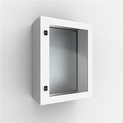 Højglanspoleret dør til erstatning af standarddøren. Giver indsigt til de komponenter, som er installeret inde i skabet. Kan bruges med alt udstyr fra låseprogrammet.