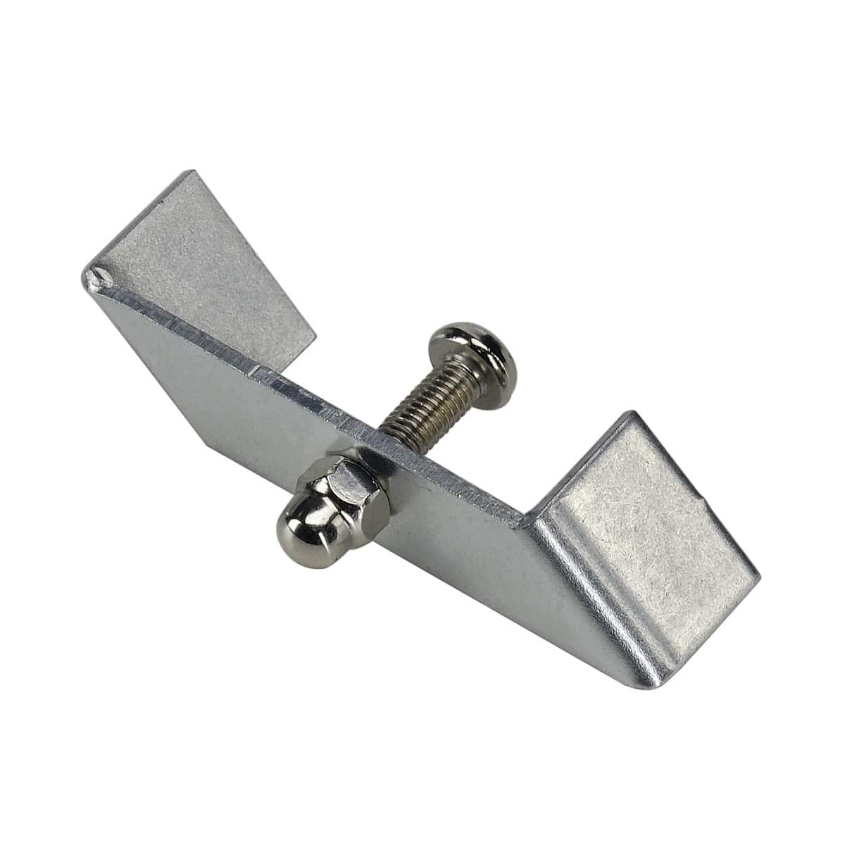 Robust holder i nikkel mat stål, designet til sikker montering af 1-faset indbygningsskinner i trælofter. Måler 75 x 15 x 40 mm.