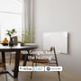 Smart infrarødt panel med 600W effekt og elegant hvidt glasdesign. Kompatibel med Google Assistant, Alexa og Siri.