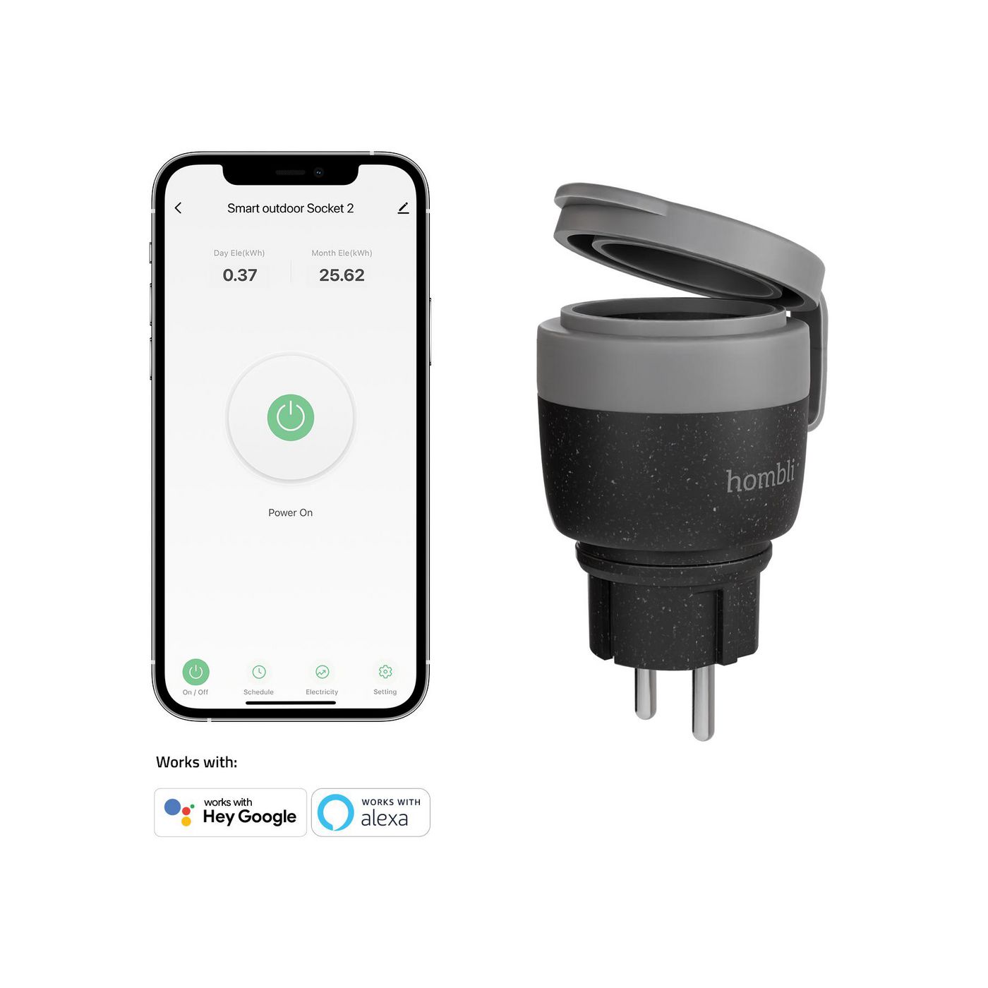 Tag kontrol over Hombli Smart Outdoor Socket 2 via den intuitive Hombli-app på din smartphone. Uanset om du er hjemme eller ude, er kontrollen lige ved hånden.