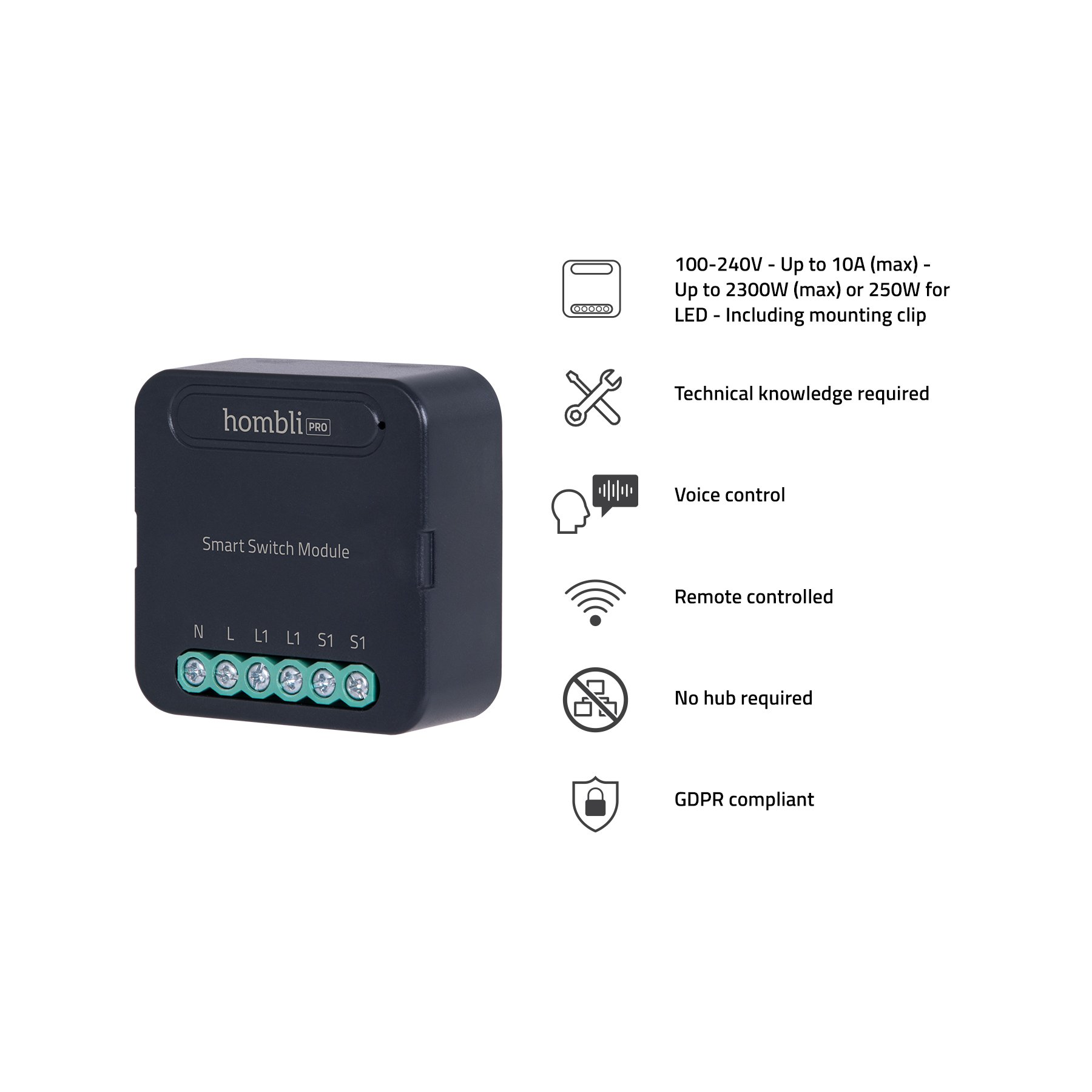- Universal Smart Switch: Gør dine eksisterende stikkontakter og afbrydere smarte. Forbindes direkte til elinstallationen.