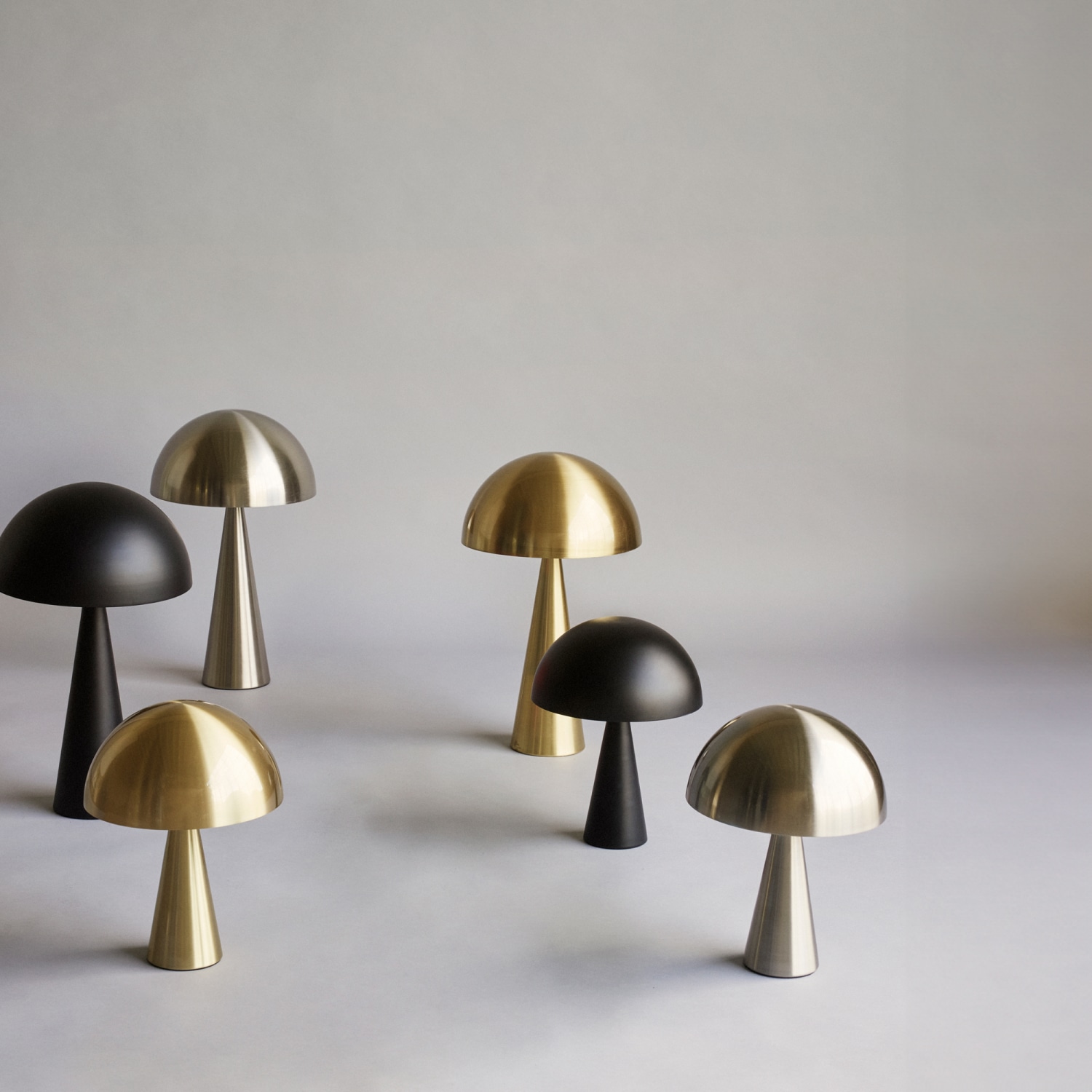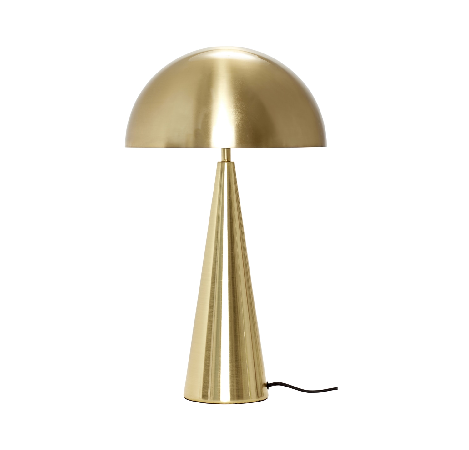 Den høje Mush bordlampe fra Hübsch kombinerer stilfuldt design med praktisk funktionalitet. Lampens messingfarve tilfører et elegant touch til ethvert rum, mens den sorte ledning komplementerer det moderne udtryk.