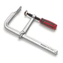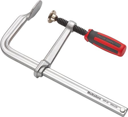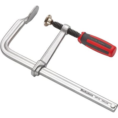 Helsmedet skruetvinge med forzinket stålprofilskinne og pivothåndtag, der giver større kraft ved stramning og løsning. Smal ende for let adgang og kraftigt gevind med bevægelig trykskive.