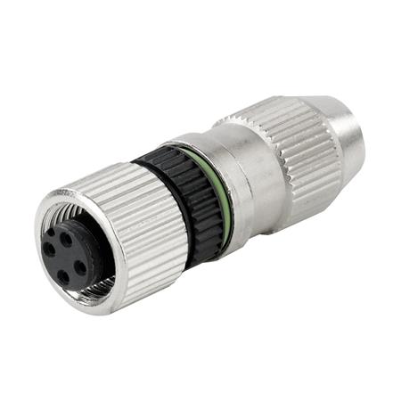 Feltkonfektionerbart M12 rundstik fra Weidmüller. A-kodet hunstik med 4 poler og IP67. Tilslutning via isolationsforskydning.