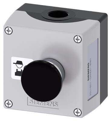 Kapsling til kommandoenheder med metalhus og grå topdel. Inkluderer trykknap, fjederterminal og sølv label.