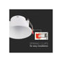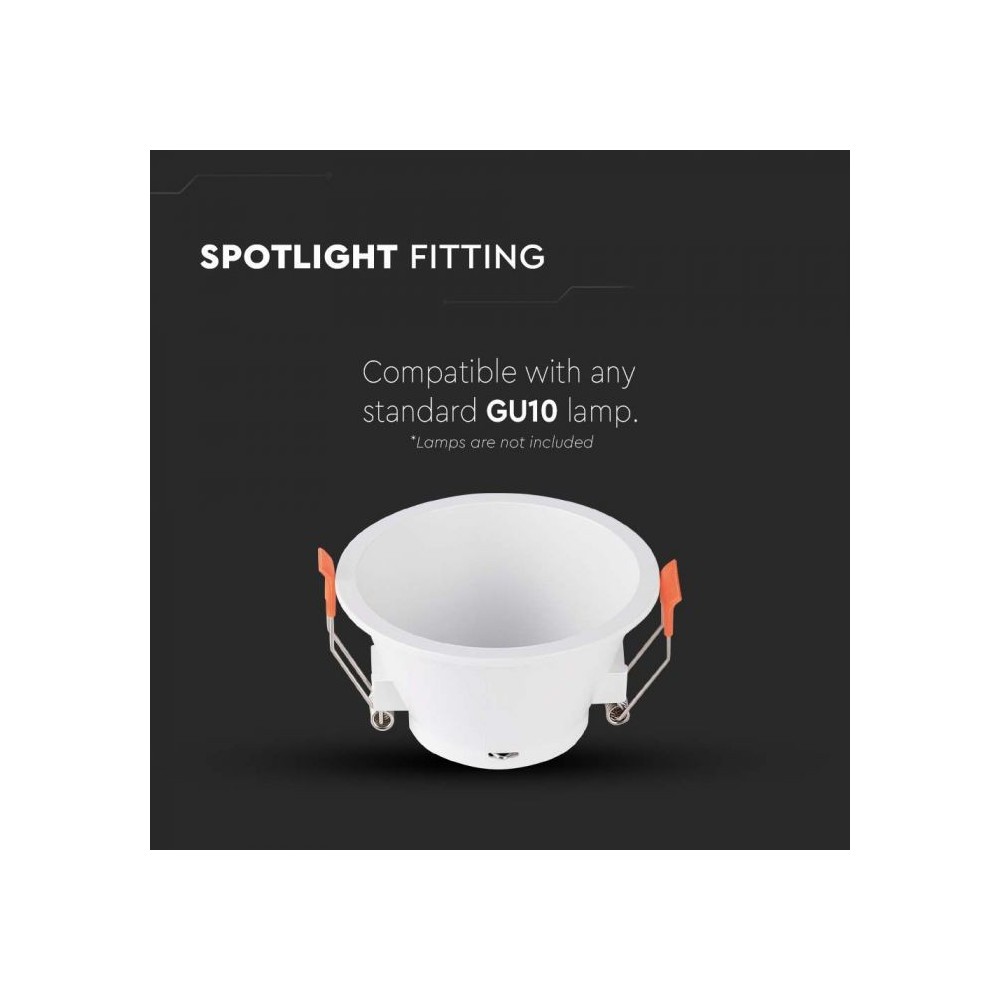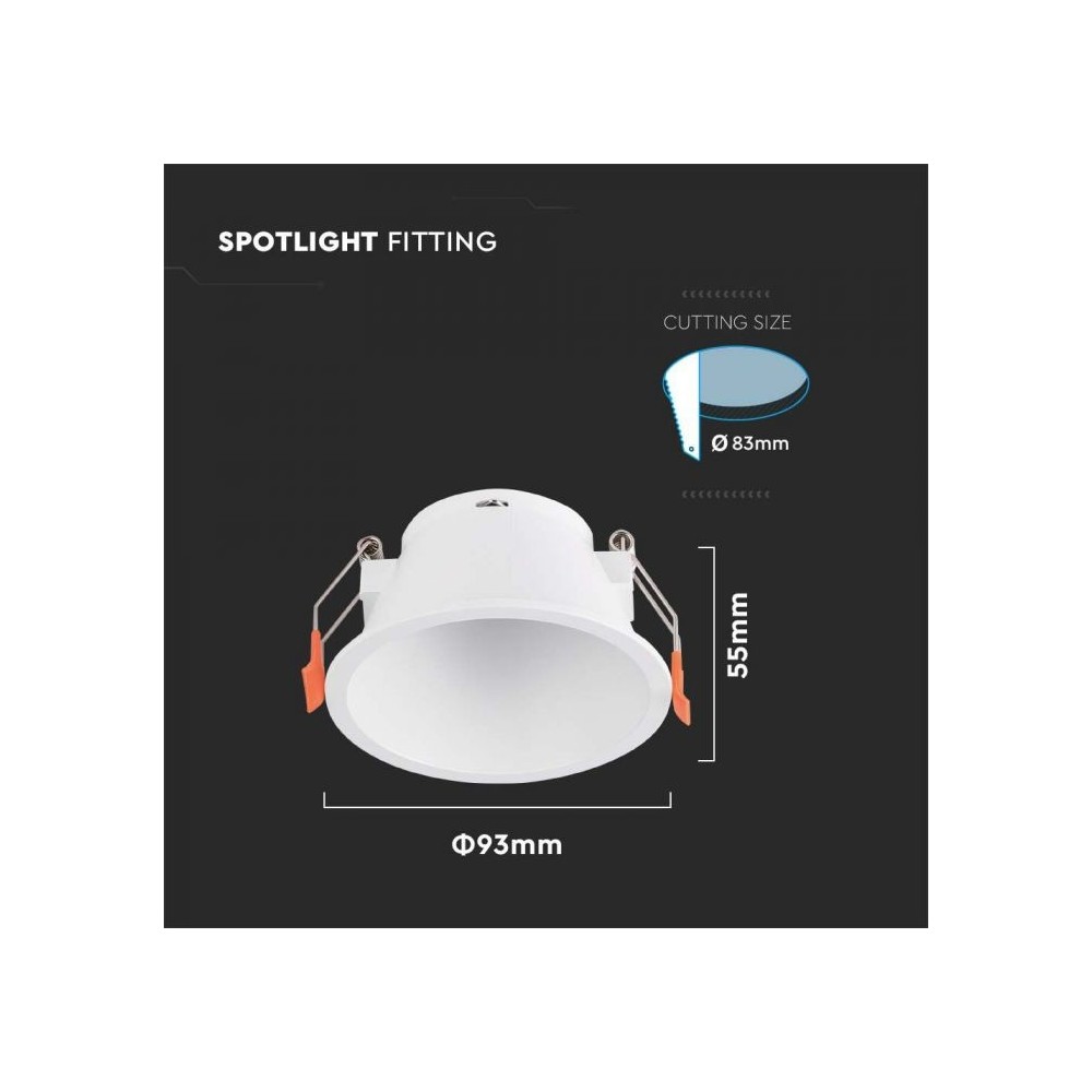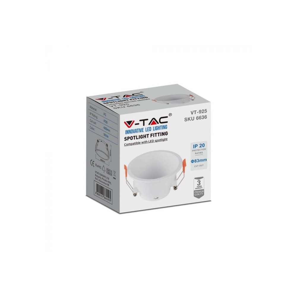 V-TAC downlight i hvid PC-plastik, designet til indbygning med en hulstørrelse på 83 mm. Kompatibel med GU10 eller MR16 fatninger.