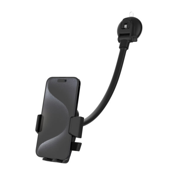 Fleksibel telefonholder til montering på forrude eller dashboard. Sikrer nem adgang til din telefon under kørsel.