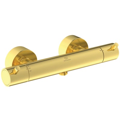 Ideal Standard Ceratherm T125 brusetermostat i børstet guld. Med keramisk ventiloverdel, skoldningsspærre og vandsparer. Inkl. forskruninger og rosetter.