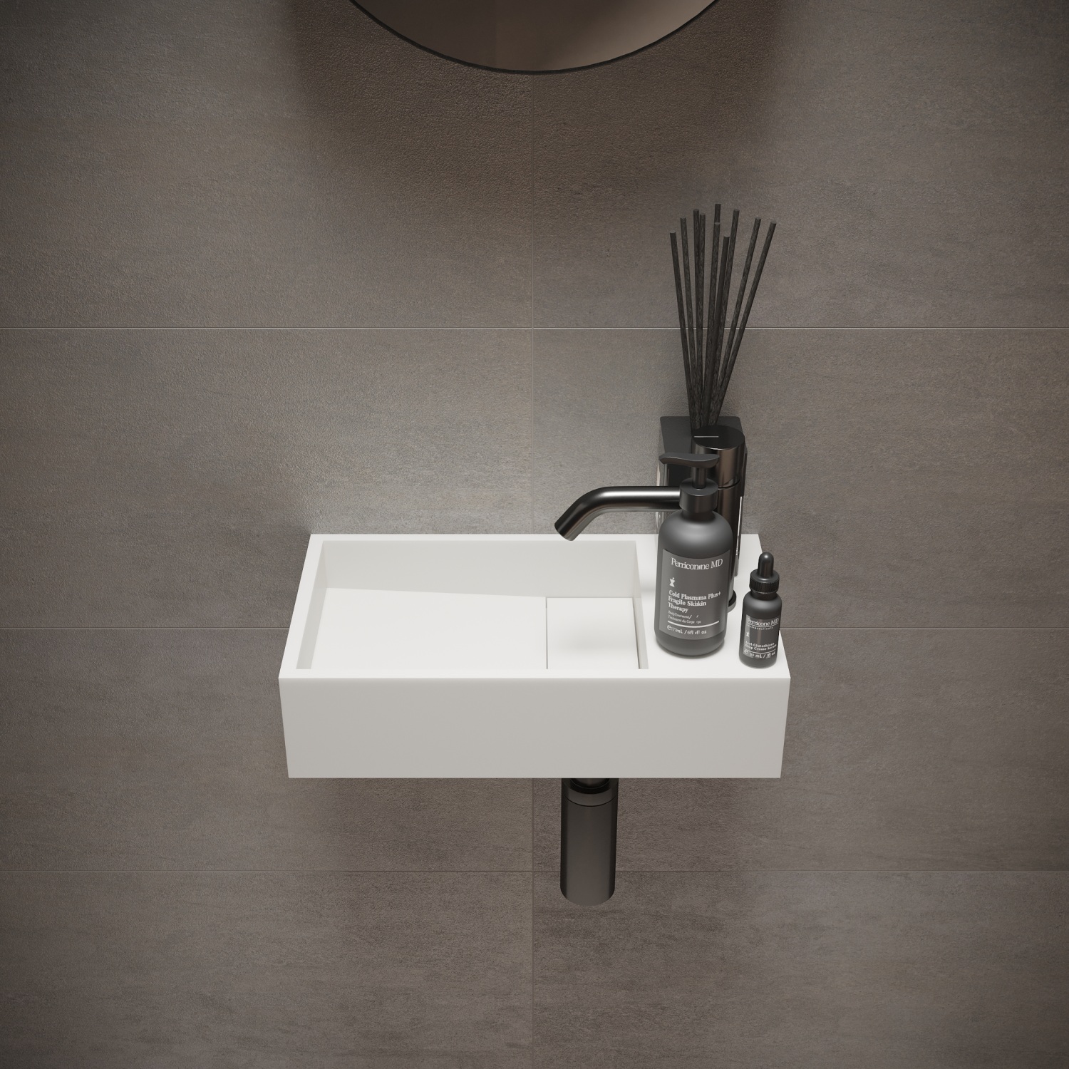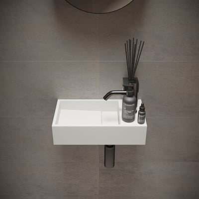 Kompakt og stilfuld håndvask i hvid mineral komposit. 40x22 cm, med hanehul og uden overløb. Ideel til vægmontering.