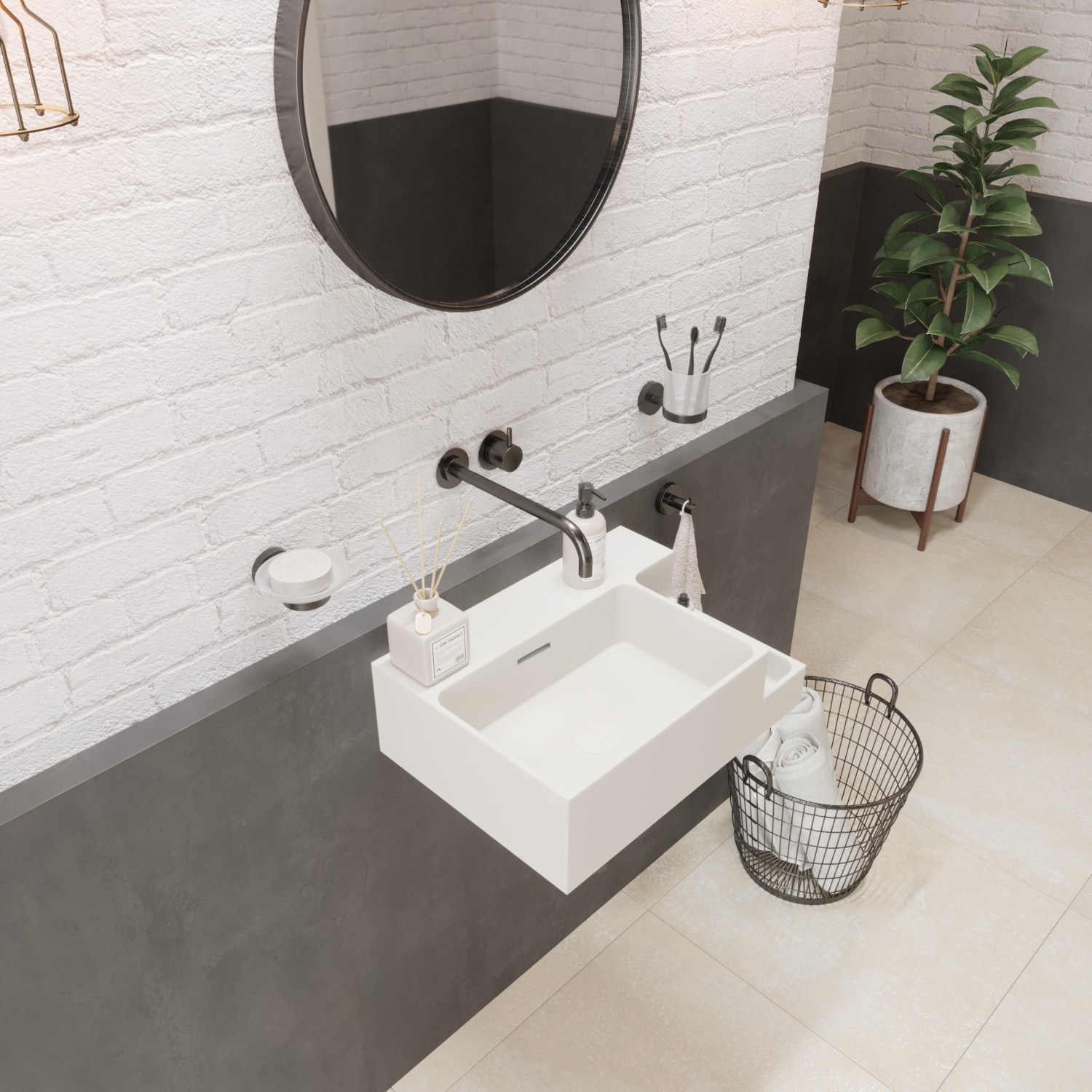 Ideavit Soliddual 1.0 håndvask i hvidt mineral komposit. Mål: 50x36 cm. Med overløb, men uden hanehul. Til vægmontering.