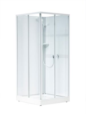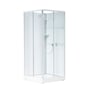 NEXT brusekabine NKH lav model, rektangulær 90x90 cm med hjørneindgang og 2 skydedøre. Perfekt til rum med lav loftshøjde. Hvide profiler, mønstret glas (3 mm) i fronten, hvidt bagpanel (3 mm).