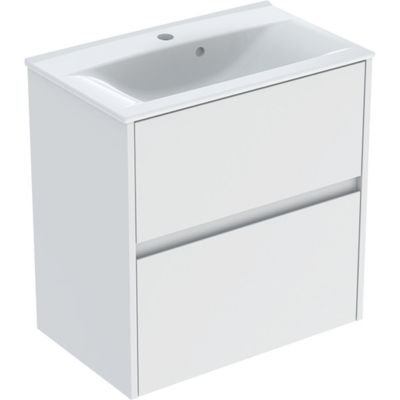 Ifö Sense Modern sæt håndvask til montering på underskab med underskab, smal kant, to skuffer, kompakt. Måler 615 mm i bredden og 618 mm i højden. Håndvasken er hvid, mens korpus og front er i lava med en lakeret silkemat finish.