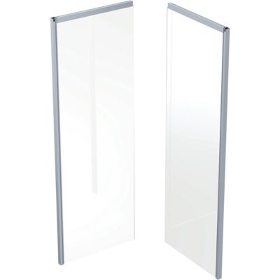 Bagelementet har en elegant sølvfarvet ramme, der giver et moderne udtryk, og er udstyret med klart glas, som skaber en lys og åben atmosfære i bruseområdet.