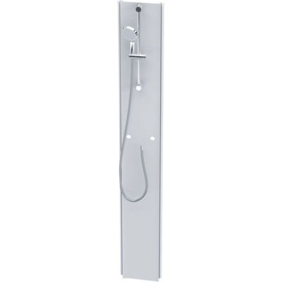 Showerama 10-5 Classic brusepanel i hvid. Modulært design med præfabrikerede huller til blandingsbatteri og højdeindstillelig håndbruser. Til montering med brusekabine Showerama 10-5.