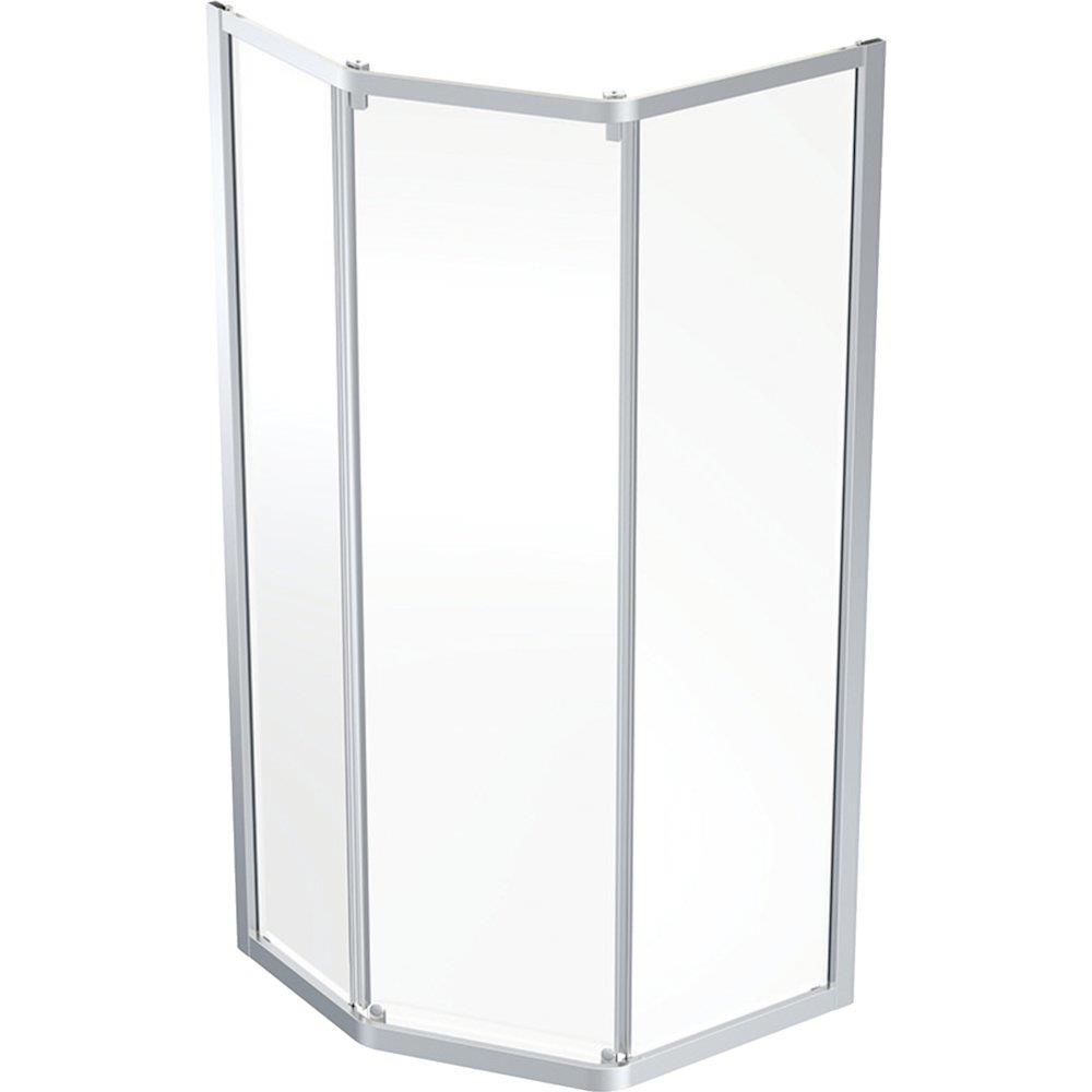 Showerama pentagonal bruseafskærmning med skydedøre og sikkerhedsglas. Måler 80 x 90 cm med transparent glas og sølvfarvede profiler.