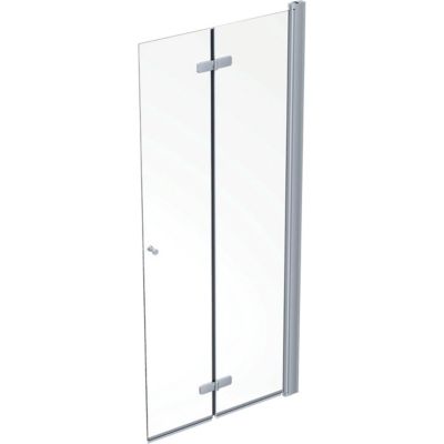 En elegant og praktisk foldedør til dit badeværelse. Halvt indrammet med sølvfinish og klart glas. Kan bruges alene eller kombineres.