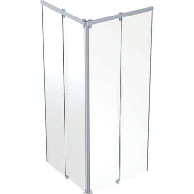 Showerama kvadratisk frontelement i målene 900x900mm. Med sølvfarvet ramme og klart glas. Har skydedørsåbning og er modulært.