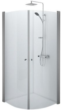 Enkel buet svingdør med mat aluminiumsprofil og klart glas. Vendbar montering og justerbarhed i bredden.
