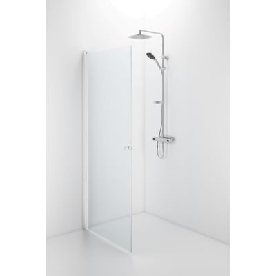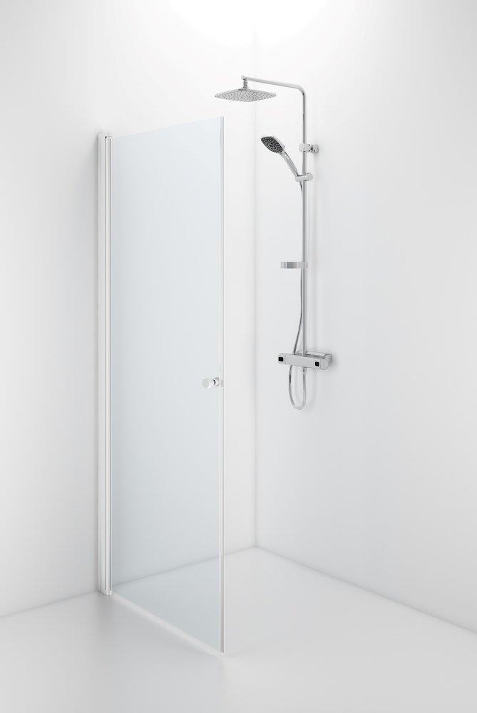 Space svingdør lige med knopgreb. Halvt indrammet design i hvid med klart sikkerhedsglas. Kan anvendes alene, med en anden dør eller fast væg.
