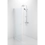 Space svingdøren er et elegant og funktionelt valg til dit badeværelse. Døren er halvt indrammet og har et stilrent design med knopgreb. Den hvide profil komplementerer det klare sikkerhedsglas, som giver et let og luftigt udtryk.