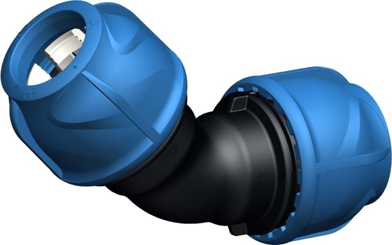 Kvalitets plastfitting fra Georg Fischer til PE-rør. Har kompressionskoblinger i begge ender og er vinklet 45°. Den bruges til samling af rør med samme størrelse når de skal føres rundt om f.eks. skarpe hjørner.