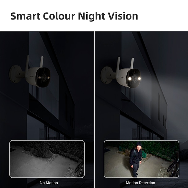 - Indbygget IR-lys samt hvidt lys, hvilket gør, at de kan se om natten og lyse op, hvis der kommer mennesker i billedet.