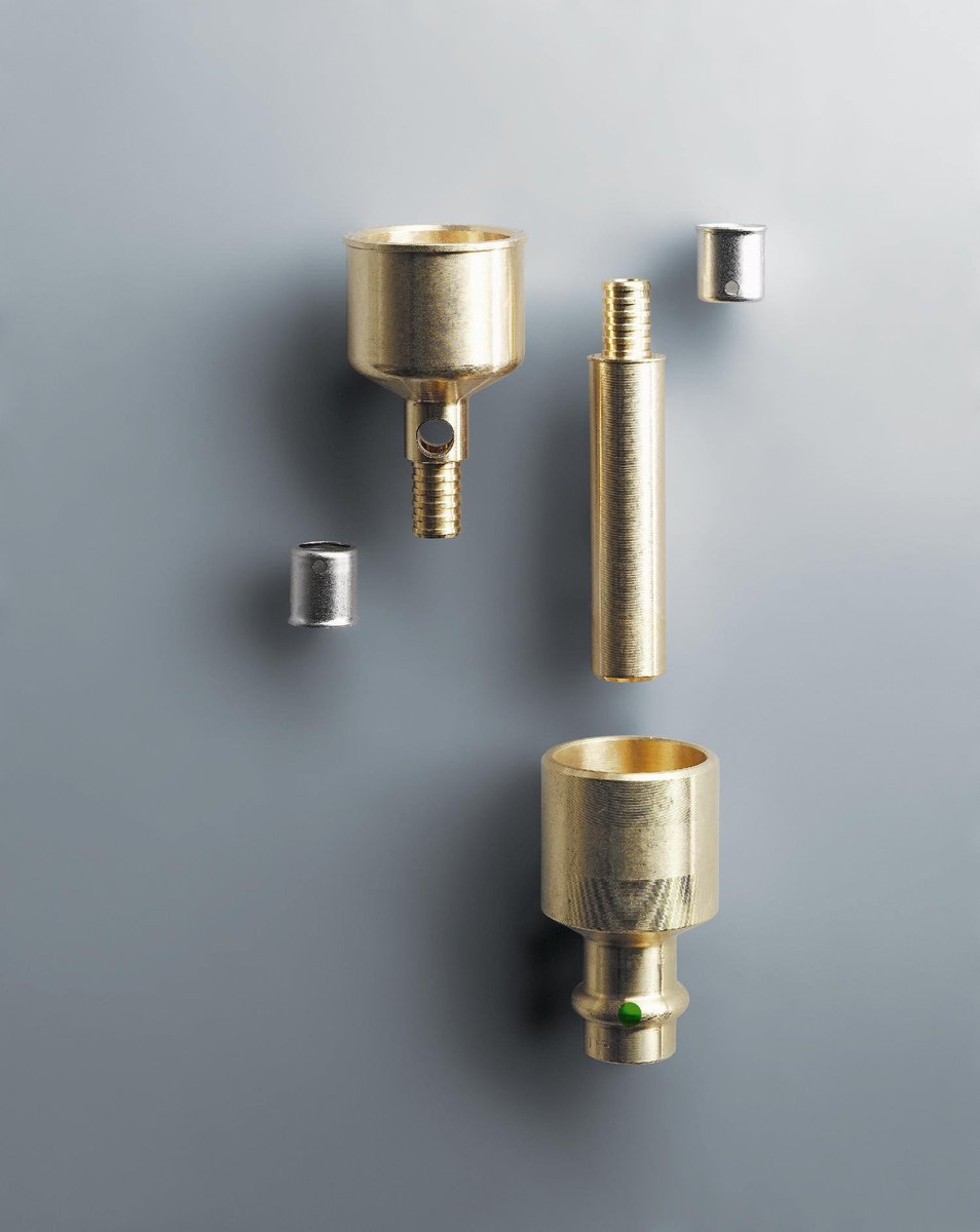 Tilslutningssættet er fremstillet i rødgods eller siliciumbronze, hvilket sikrer høj kvalitet og lang holdbarhed.