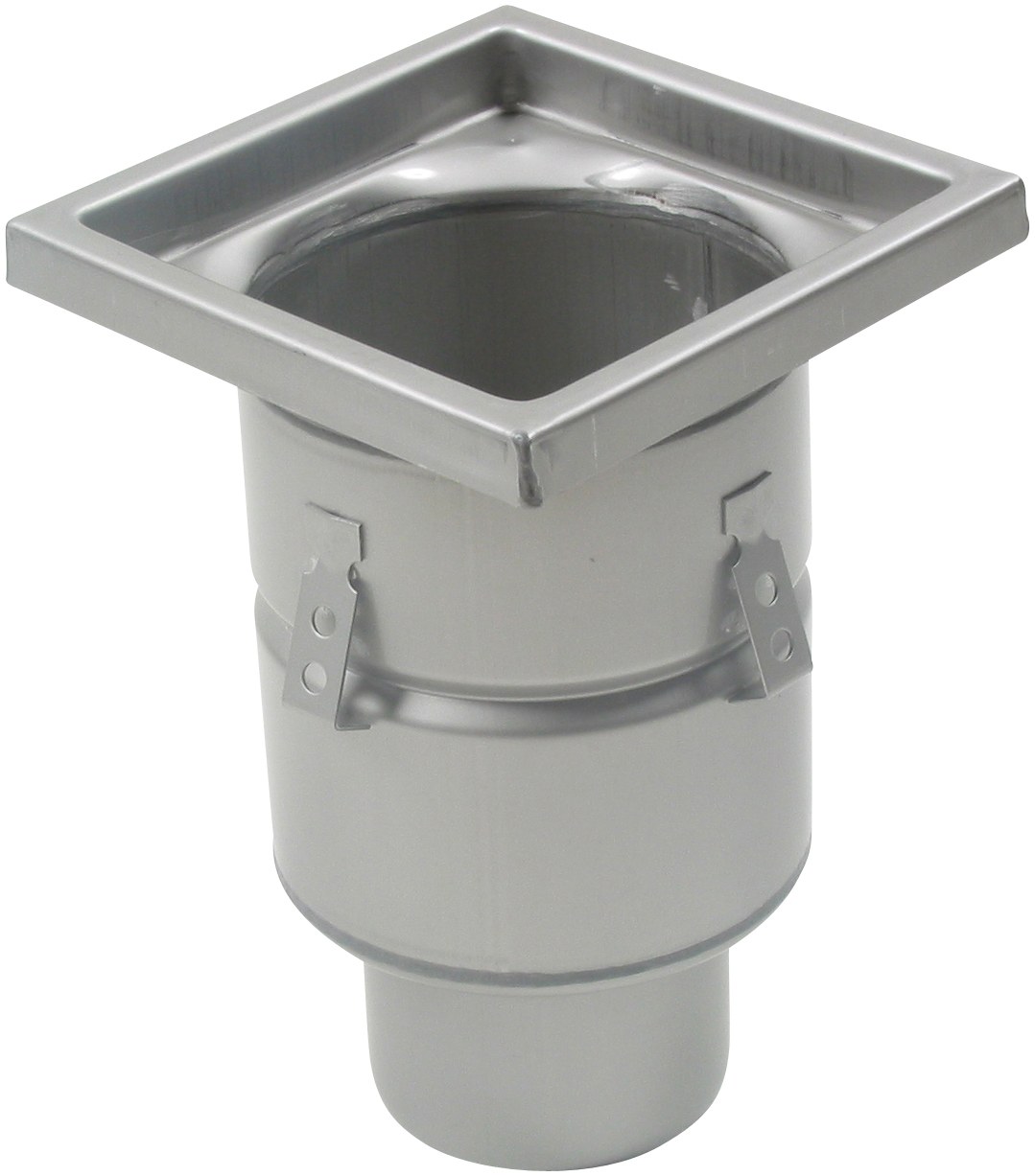 BLÜCHER industriafløb til beton- og klinkegulve med lodret Ø110mm udløb og 200x200mm ramme. Fremstillet i syrefast stål AISI316L/EN1.4404.