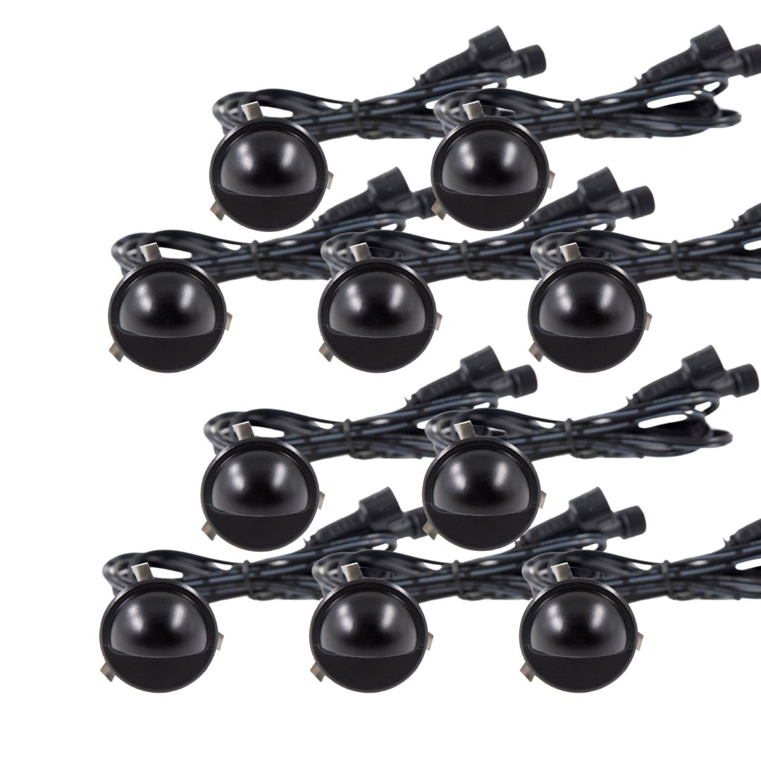 Elegant indbygningsspot i sort til udendørs brug. 10 stk. pak med 12V, 0.4W og varmt hvidt lys (2900K). IP67-klassificeret og dæmpbar.