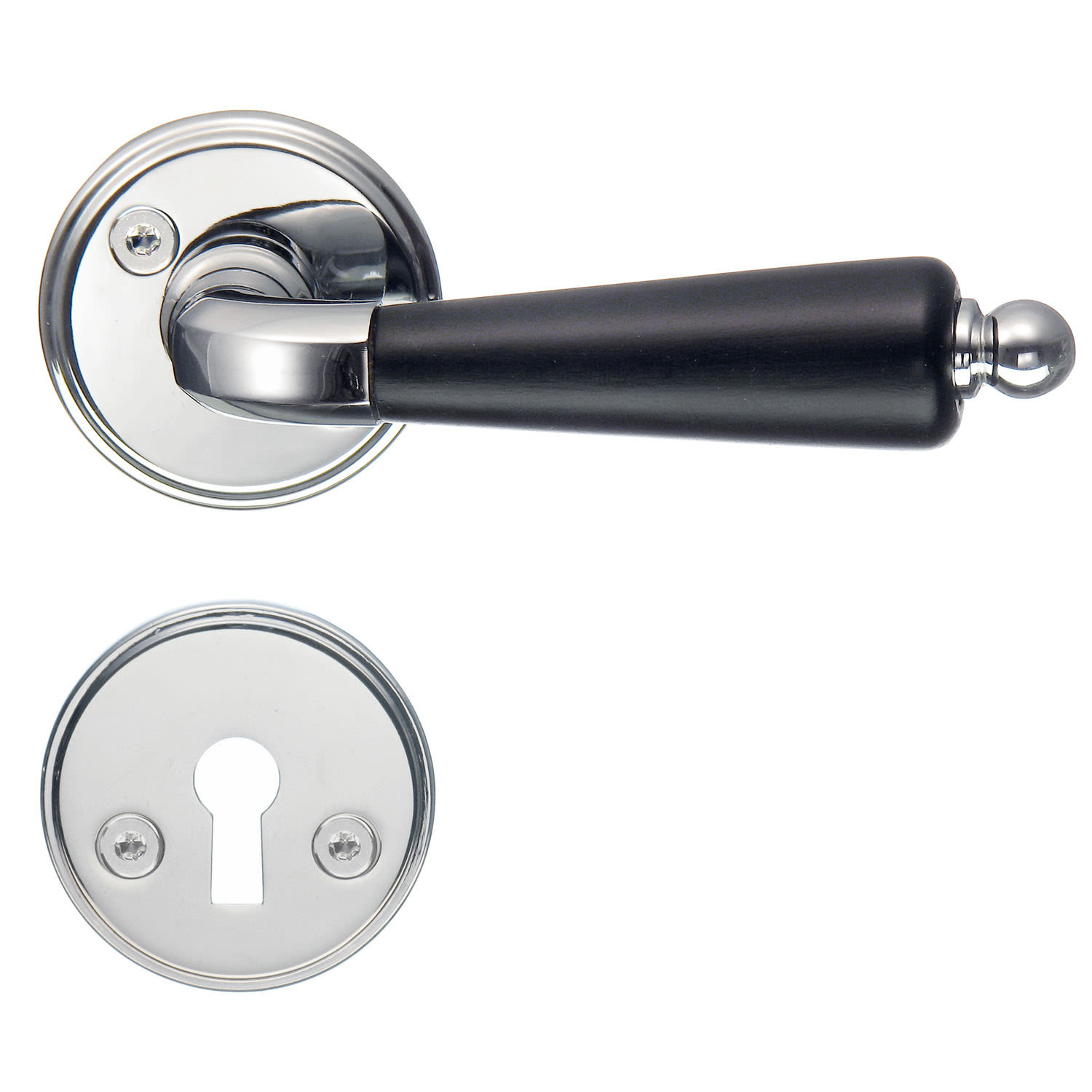 Elegant indendørsgreb i poleret krom og sort ABS-plastic, designet til indvendige døre med en tykkelse på 38-45 mm.