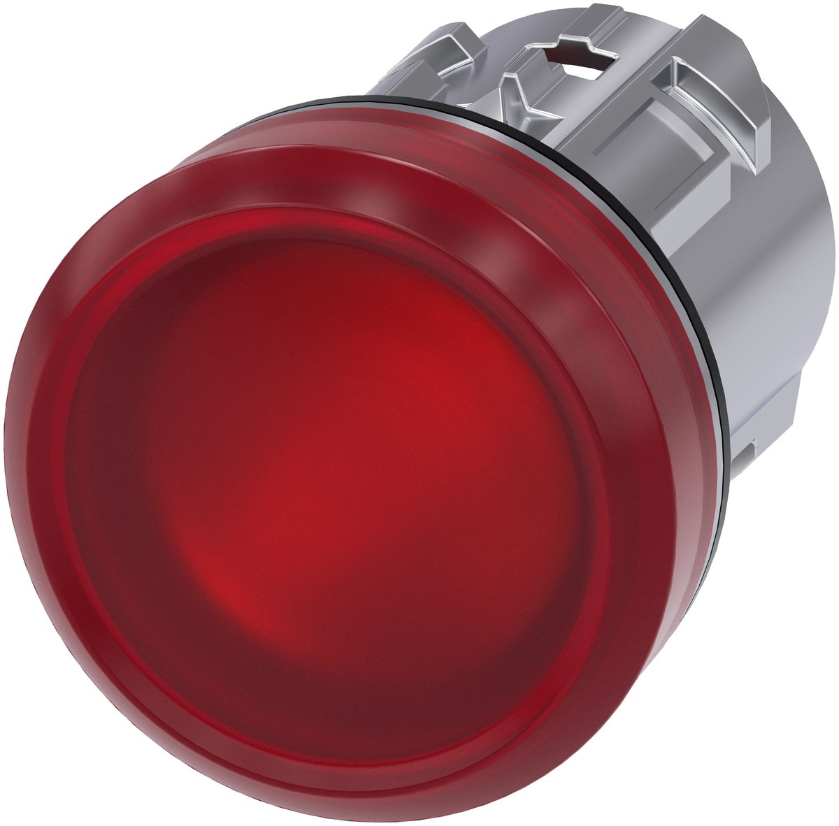 22 mm signallampe fra Siemens' SIRIUS ACT-serie. Robust design i metal med højglans finish og rød, glat linse. Ideel til signalering i industrielle miljøer.