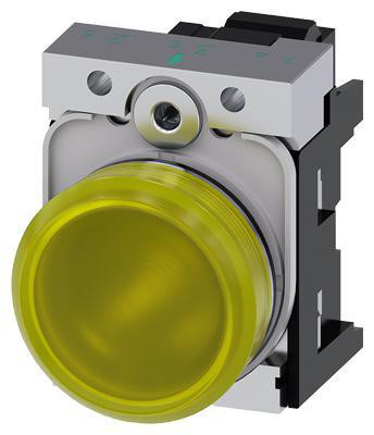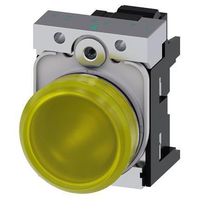 22 mm indikatorlampe med gul linse, glat overflade, holder og integreret LED modul. Designet til 110 V AC med fjederterminal.