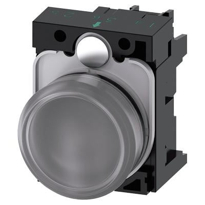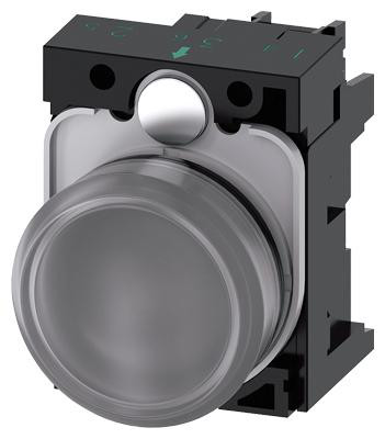 22 mm indikatorlampe med klar, glat linse, holder og integreret LED modul. Tilsluttes 110 V AC via skrue terminal.
